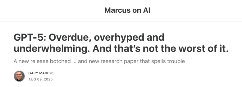 Marcus quoted other tech-watches disappointed by GPT-5’s intrinsic short-comings.