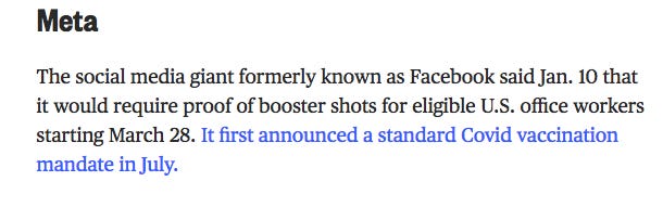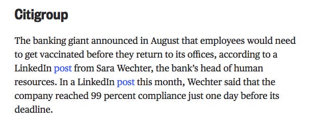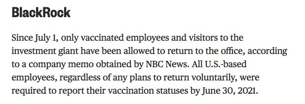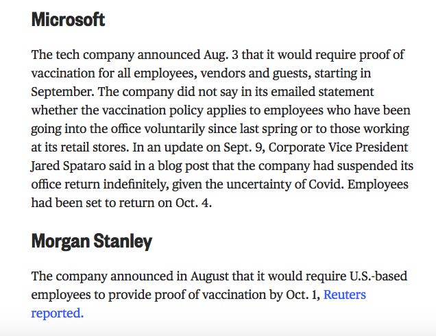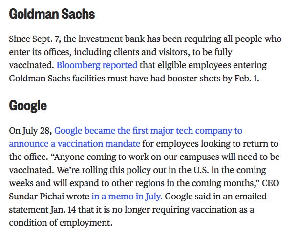 You may here be reminded of ‘Employers’ mandating ‘Vaccines’ against “ ‘COVID-19’ “ in 2021 and 2020 particularly. Then, too, the Corporations most Insistent on Obedience were ‘Tech Titans’ and the most major of Banks on Wall Street and in the City of London and Geneva, Switzerland.