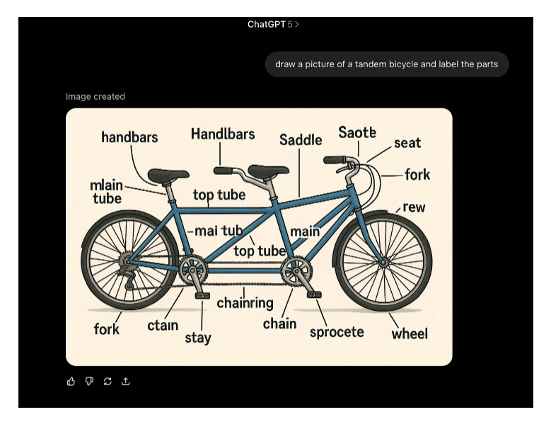 GPT 5 was asked to ‘draw a pictue of a tandem bicycle and label the parts.’