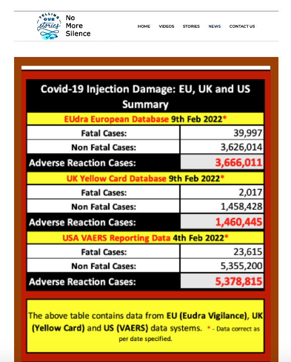 The 2022 website No More Silence / Telling Our Stories counted more than 10 million ‘Adverse Reactions’ and more than 63,000 ‘Fatal Cases’ on February 9, 2022, as shown on my ‘Undoing Evil #8’, the Flipping the Script blog, on donpaulwearerev.com website.