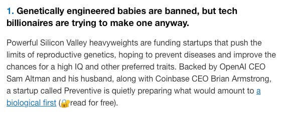 They mean well, y’unnerstand, the ‘Powerful Silicon Valley heavyweights’. They ‘push the limits of reproductive genetics […] to prevent diseases’ and raise us to ‘a high IQ and other preferred traits.’ OpenAI CEO ‘Sam Altman and his husband, along with Coinbase CEO Brian Armstrong’ back ‘a startup called Preventive’ that’s ‘quietly preparing what would amount to a biological first’.