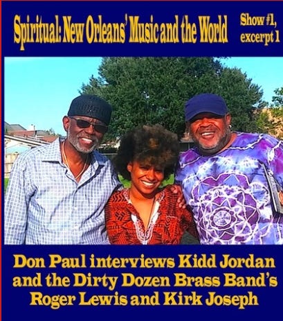 40:05 Jumping again, 10 years forward, to the interview of 2015 with Kidd on the first “Spiritual: New Orleans’ Music and the World” show for Let’s Live Radio. Kidd’s students Roger Lewis and Kirk Joseph of the Dirty Dozen Brass Band were the other interview subjects on this show. Kidd had helped the Dirty Dozen travel to Europe for the first time, 1982, to a venue in Groningen, the Netherlands.