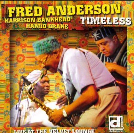 21:15 Honoring these creators, let’s listen to the opening minutes of “By Many Names” from the 2005 album Timeless on Chicago’s Delmark label, with Fred, Hamid and Harrison live in the Velvet Lounge of Chicago’s Near South Side.