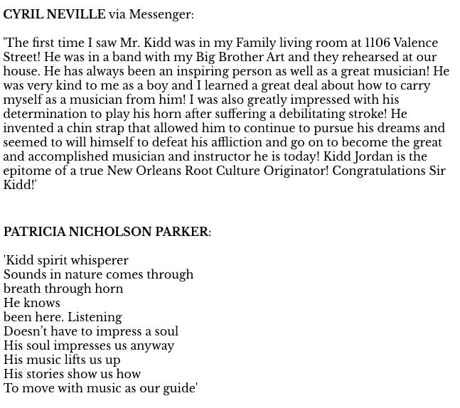 Cyril Neville and Patricia Nicholson Parker among the 16 Appreciations of Kidd registered for the ‘Honoring the Kidd” Concert of November 1, 2019 at the New Orleans Jazz Museum.