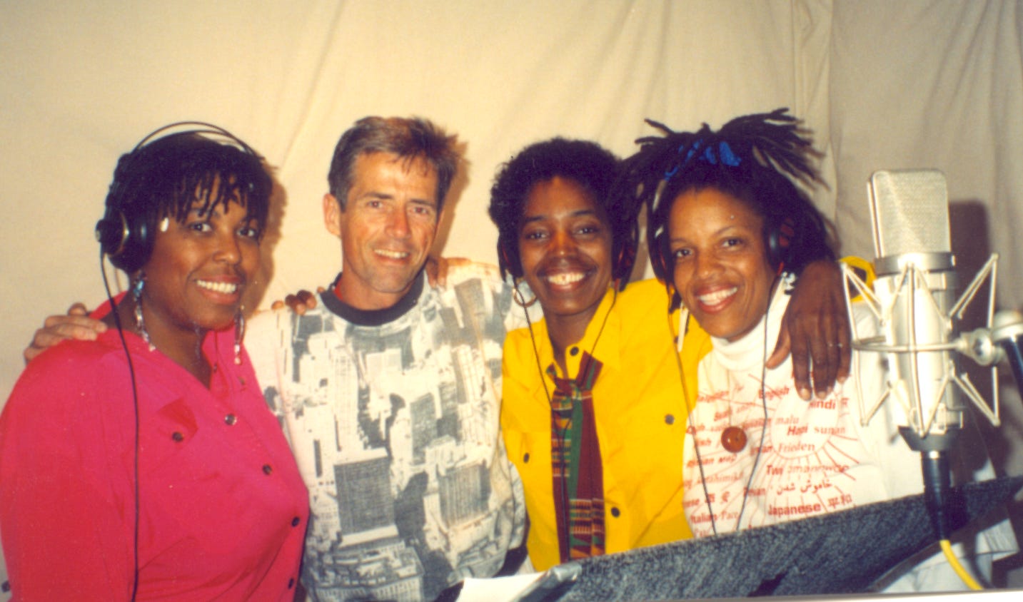 We overdubbed tremendous enhancements. INDIA COOKE on Violin swings, swings, swings on “Love Is The Main Flame”, dancing like water with John Baker’s piano, and rips into “Aoww, Like A Hammer Blown” with the ferocity of a born, improvising sympathizer. The Trio of singers known as JoiJoi (pronounced with proper brio “Joy-Joy!”, LOUISE ROBINSON, MICHELLE JACQUES, and DARLENE SPEARS), grace “Love Is The Main Flame”. “When That Evening Sun Goes Down”, and “Let The Children Come.”
