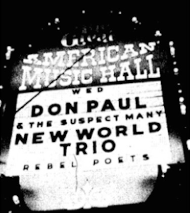 In late July 1991 we played one of San Francisco’s finest venues, the Great American Music Hall. That Wednesday night was phenomenally loaded in the City. DONOVAN played Slim’s, with the American Music Club opening. Boukman Ekperyans was at DNA to promote its Grammy-nominated first album, Vodou Adjae. And GIL SCOTT-HERON performed at the Kennel Club, out within Blacks’ Fillmore neighborhood, with MICHAEL FRANTI and CHARLIE HUNTER. Oh, those San Francisco bills! We were very pleased to draw 158—and to enjoy the inspiration that Rebel Poets ALFONSO TEXIDOR, Q. R. HAND, VERNON EDGAR, and DEVORAH MAJOR and their improvising musicians (HENRY KAISER, DHYANI, GEORGE, JOHN, STEVE, MARCOS SANTOS) and INDIA with her New World Trio of EDDIE MARSHALL and KASH KILLION) shared like fire works in the rococo, born-for-burlesque-in-1907 setting of the GAMH. Thank you, again, ANNIE O’TOOLE, and DERK RICHARDSON and CLAUDE PALMER and photographer TOM MORGAN for being there! Everything lifted on that night.